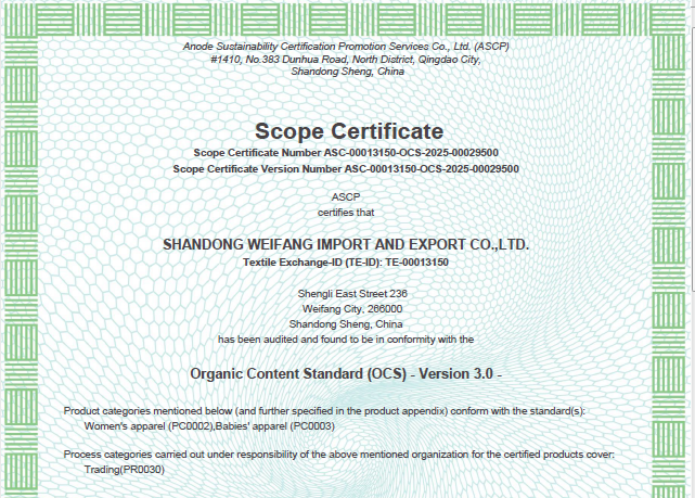 公司自營和代理服裝、食品、五金、化工、機電等各類商品及技術的進出口業務,公司有專門的生產、加工基地,并通過了Oeko - Tex Standard 100、GRS、OCS、RCS、USCTP等多項認證,可以按客戶要求設計生產,同時承辦中外合資經營、合作生產、開展“三來一補”以及技術輸出、易貨、邊境貿易等業務。公司產品出口到日本、法國、俄羅斯等50多個國家或地區。